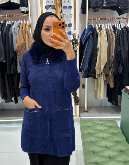 yaka kürk uzun hırka Lacivert